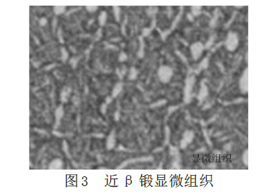 如圖3所示,為近β鍛工藝鍛件的顯微組織。其初生α含量約20%,條狀α沿原始β晶界分布,原始β晶粒尺寸較小,晶界基本破碎,為等軸α+條狀α+β狀的三態(tài)組織。