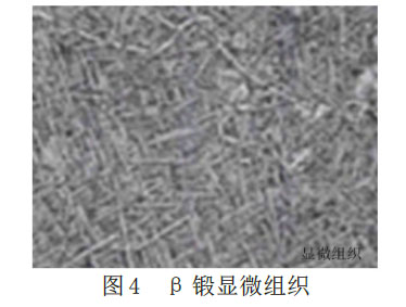 圖4為β鍛顯微組織圖,該顯微組織可以反映相變點的熱變形量,經(jīng)過研究證明,其在某個固定溫度可以導(dǎo)致鍛造變形,從而使顯微結(jié)構(gòu)發(fā)生轉(zhuǎn)變。