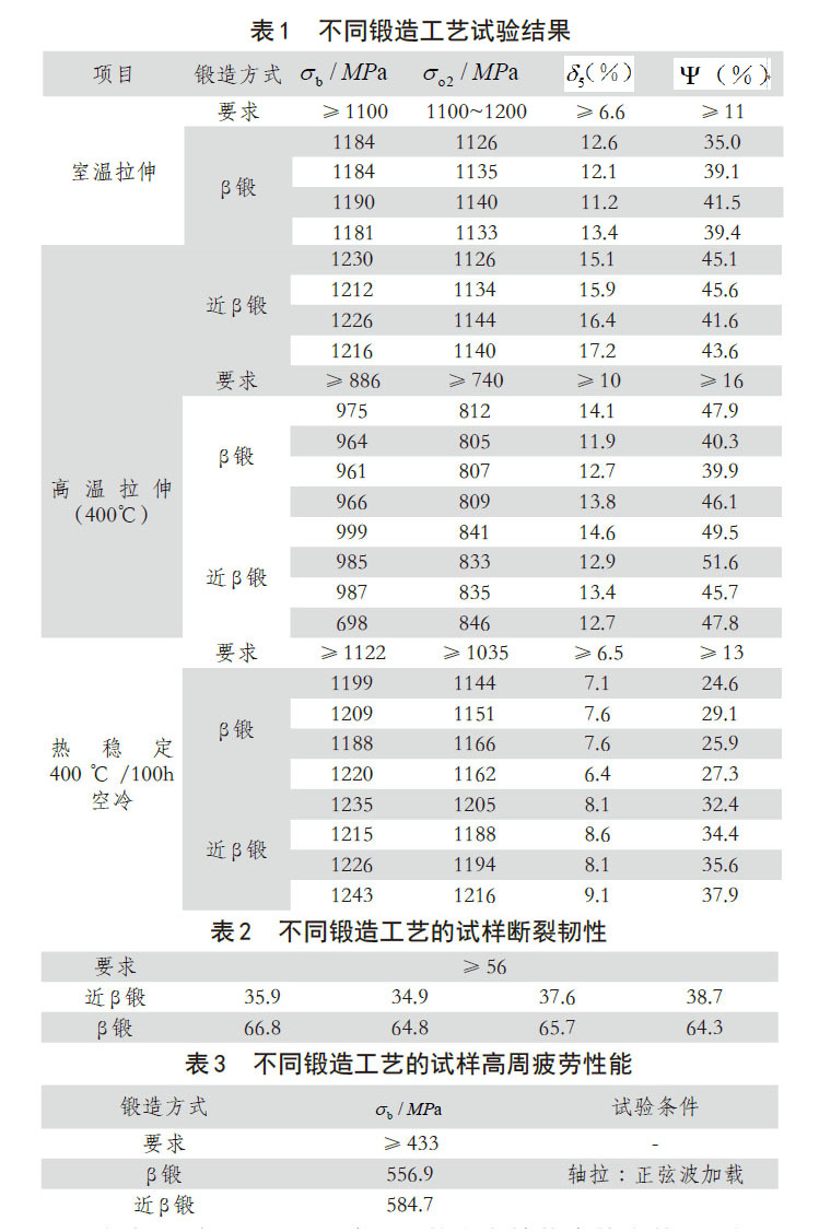分別使用兩種不同的鍛造工藝,即近β鍛和β鍛,根據(jù)這兩種鍛造工藝進(jìn)行性能檢測,分別檢測室溫拉伸,高溫拉伸和熱穩(wěn)定狀態(tài)下兩種鍛造方式的性能差異,由于鍛造工藝受到金屬本身的性能影響,因此需要提前進(jìn)行熱處理才能進(jìn)行后續(xù)試驗,檢測結(jié)果如表1~3所示。