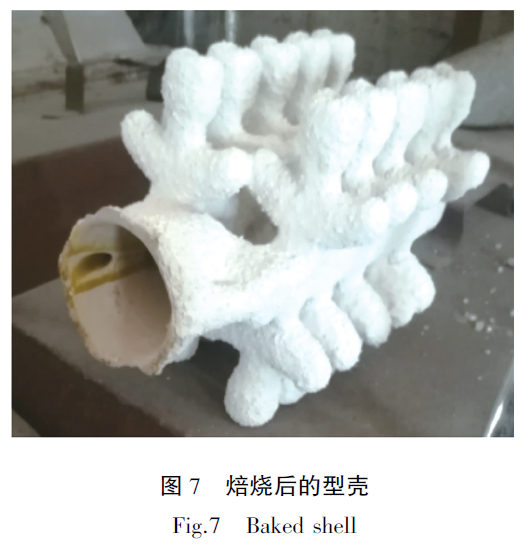 樹脂模在焙燒過程中容易發生膨脹脹裂型殼,本工藝樹脂模因其表面涂有蠟,預熱溫度60℃時蠟已經開始融化,使模型與殼之間產生了間隙,徹底解決了因樹脂焙燒膨脹而對模殼產生的脹裂問題。樹脂模必須采用天然氣爐焙燒,樹脂在天然氣爐中瞬間燃燒消失減少了其因膨脹而對型殼損壞。圖6 為天然氣焙燒爐,圖7 為焙燒后的型殼。制好的的型殼組盤后即可澆注,澆注好的鑄件如果是重量輕、壁厚薄的鑄件其表面污染層薄,無需專門去除,經過熱等靜壓、精整和包裝后即可發給客戶。